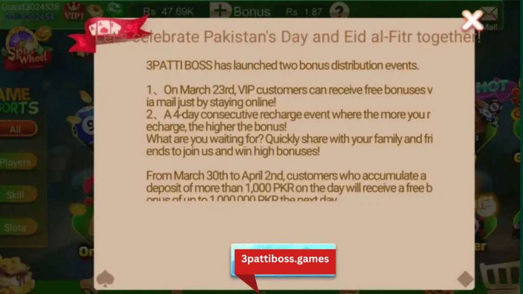 3 Patti Boss’s Pakistan Day and Eid Ul Fitr celebrations are more than just in-game events—they’re a vibrant fusion of national pride, cultural joy, and community spirit. Whether you’re competing for cash prizes on Pakistan Day, sharing festive Eidi rewards with friends, or simply enjoying the themed gameplay, these events offer something for everyone.